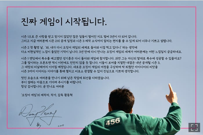 오징어게임 시즌2는 시즌1에서도 감독을 맡았던 황동혁 감독이 맡았습니다. 최근에 황동혁 감독은 시즌2만 생각하고 있던 시청자들에게 올해 시즌2를 방송하고, 내년에 시즌3을 마지막으로 오징어게임이 종영함을 알렸습니다.