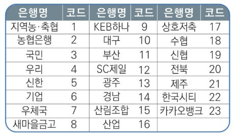 아래 은행코드를 참고하여 수령할 은행계좌를 등록합니다.